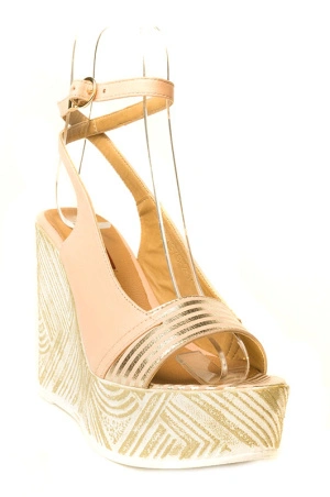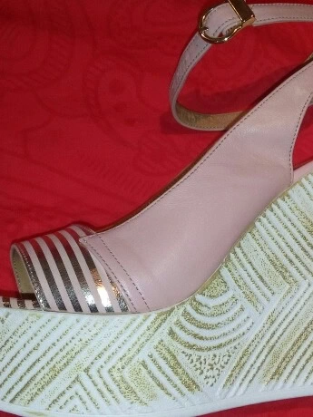 Босоножки красивые, бледно розового цвета с золотыми полосками. Высокая удобная платформа. Полное соответствие размерной сетке, на широкую ногу. Цена даже со скидкой сильно завышена.