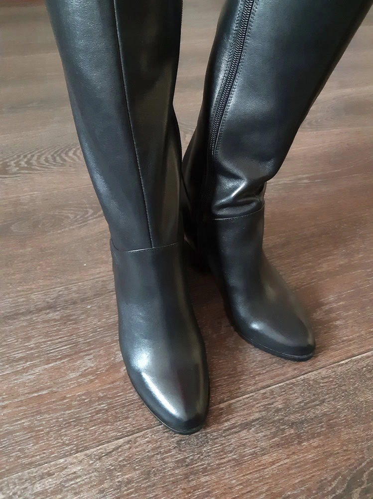 Сапоги и правда мечта! Еле застегнула, но думала все равно возьму, кожа мягонькая, каблук красивый. Но вот при моем росте 160 слишком длинные, конда садишься упираются неприятно под коленкой. Тоже плакала, когда отдавала. В размер.