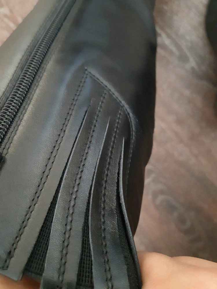 Сапоги на узкую ногу, но в то же время на широченную икроножную мышцу. У меня не очень худые икры, но при примерке сложилось впечатление, что смело можно на 2 ноги натянуть сапог. Особенно смутила форма голенища... оно не лежит по ноге, а закруглено сзади... смотрится достаточно нелепо. Кожа мягкая, вызывает сомнения. Отказ