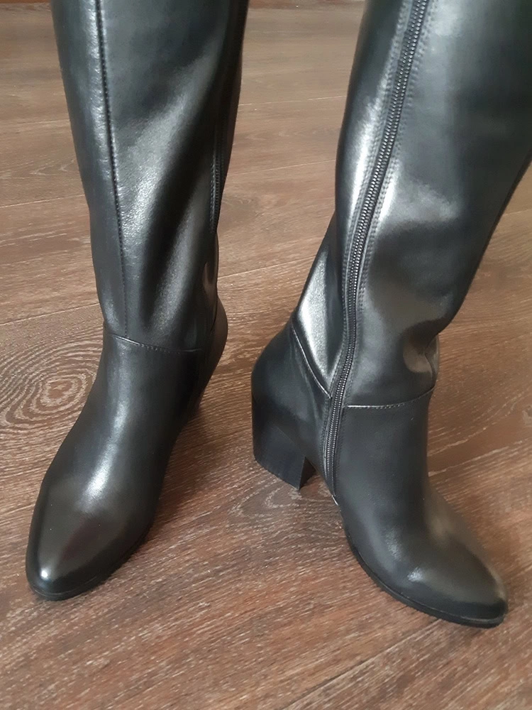 Красивые сапоги, кожа мягкая. Каблук устойчивый. Голенище узкотовато для меня.