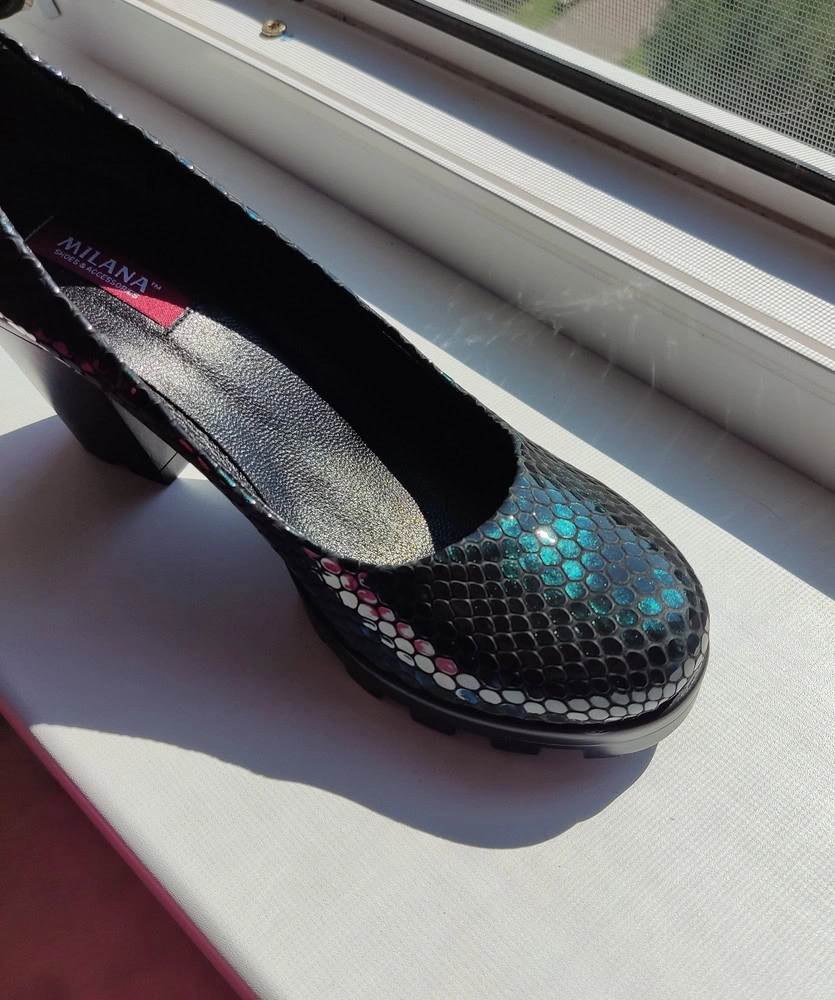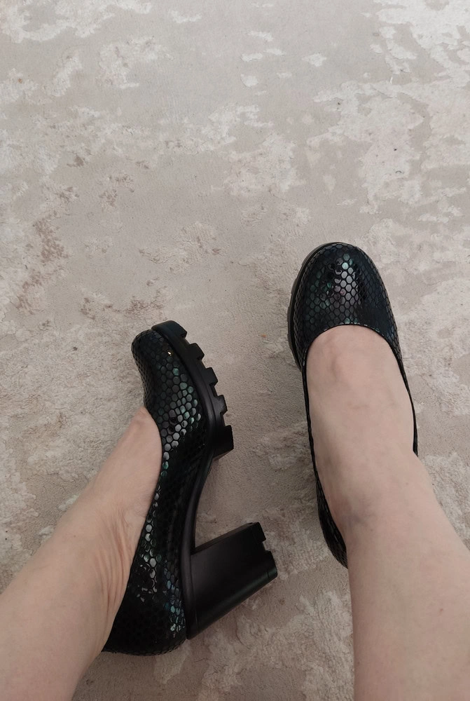 Туфли классные! Давно искала на невысоком каблуке и чтобы современные были. Очень комфортные на широкую ногу. Особенно понравился цвет. Переливы зеленого очень красиво. Со скидкой обошлись за 4530 р. Спасибо магазину.