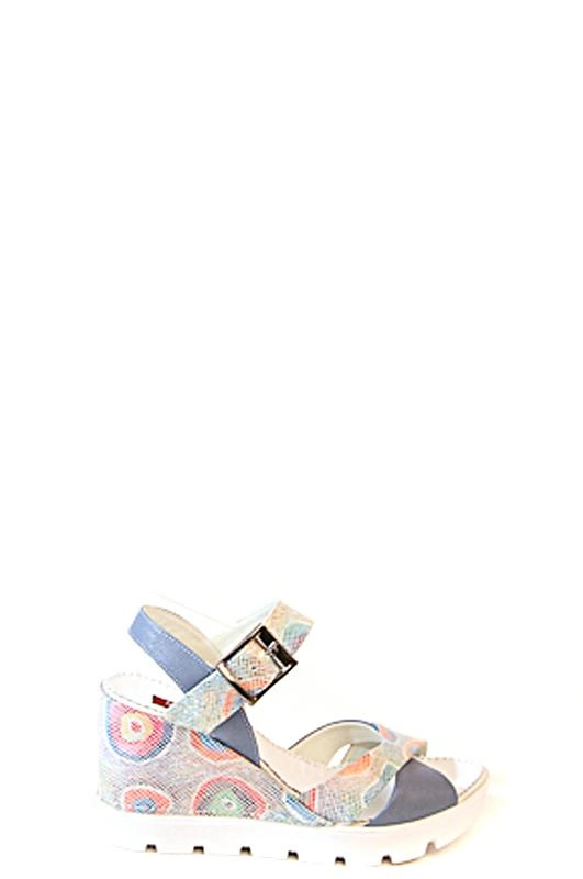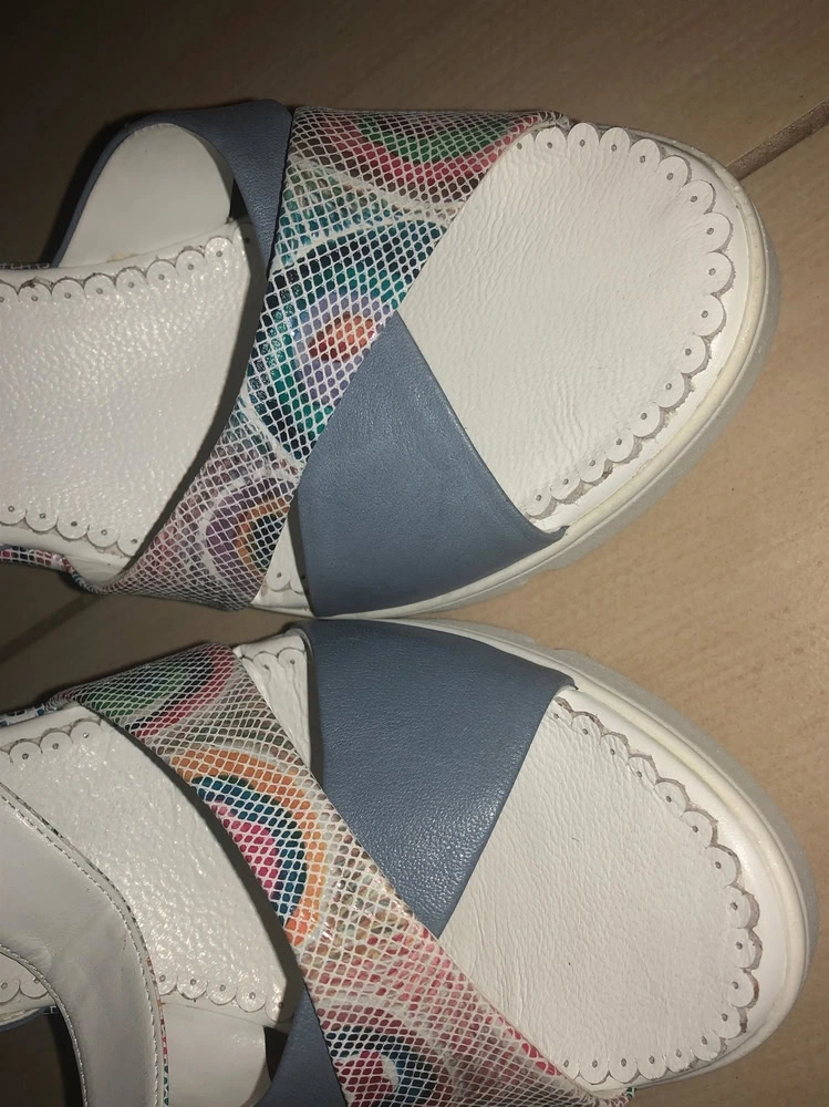 Лёгкие и удобные пастельные босоножки на НЕширокую ногу; многоцветная часть выполнена из мягкой кожи под змею с небольшим блеском, однотонные ремешки исполнены матовой кожей. Пряжка из металла оловянно-серебристого оттенка. На русский 38,5 по следу 39 в самый раз. НО, повторюсь - пара на УЗКУЮ ступню; в противном случае передние ремешки пережимают ногу и заметно давят. Поэтому, увы, возврат :-(