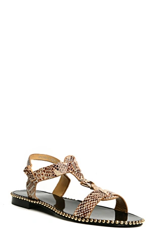Стильные лакированные бежевые сандалии не остаят Вас без внимания. Прекрасное дополнение к ярким летним образам. Подошва по краям декорирована металическими клепками. Модель выполнена с тиснением под кожу рептилии. Ремешон обеспечит надежное фиксирование обуви на ноге