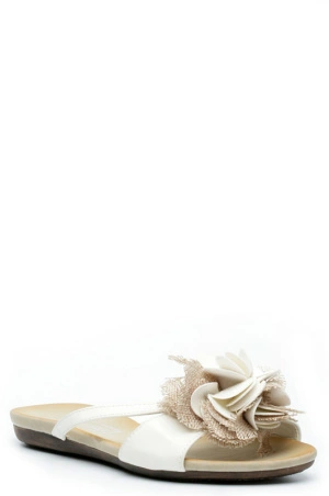 Стильные белые шлепанцы. Подошва выполнена из твердых и прочных материалов. Мысок закруглен, Декорированы великолепным цветком. Отлично подойдут для летнего отдыха.