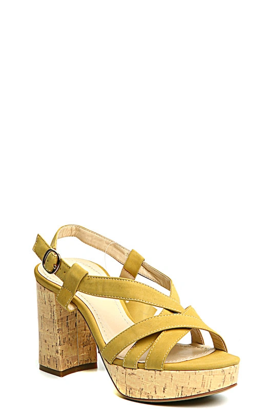 Стильные желтые босоножки на устойчивом каблуке. Прекрасное решения для повседневного ношения, благодаря высокому подъему высота каблука не чувствуется. Каблук оформлен орегинальным ричунком под пробку. Ремешок надежно зафиксирует обувь на ноге. Босоножки привлекут внимание настоящих можниц.