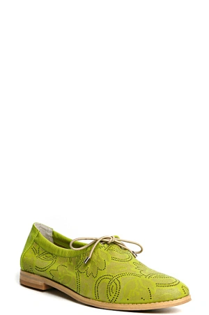 Стильные зеленые полуботинки, декорированы перфорацией в виде узора. В этой модели Ваши ноги несомненно будут дышать. Мысок закруглен. На шнуровке. что позволит отрегулировать обувь на ноге. Хорошо подойдут для длительных прогулок и создания романтичных и ярких образов.