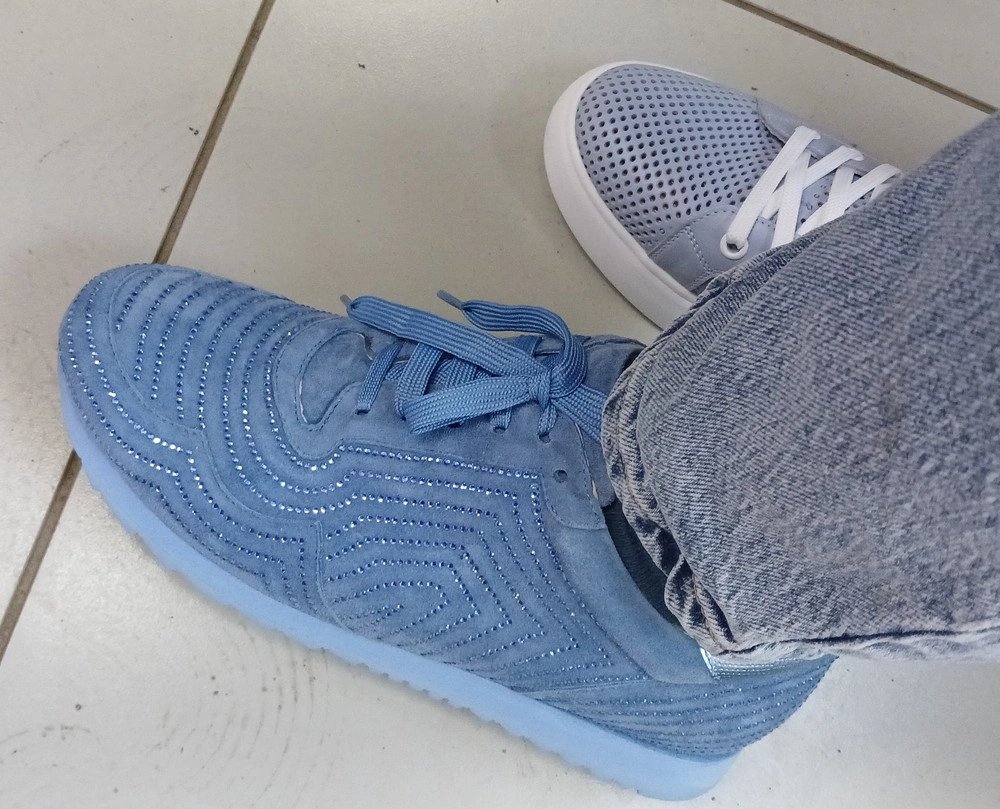 Кроссовки симпатичные, но цвет в реале бледнее, на фото без вспышки разница видна, пришли абсолютно новые, всё упаковано идеально, со всеми пенопластовыми вставками для формы внутри, есть стразы про запас. Это 3-я пара обуви этой ТМ и все большемерят, у меня 39 размер, кроссы взяла 38 и подошли