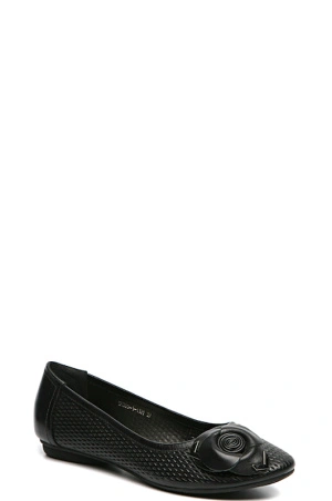 Женственные черные балетки. Удобная мягкая подошва, благодаря которой Ваши ноги будут чувствовать комфорт на протяжении всего дня. Мысок закруглен, декорирован цветком. Перфорированы