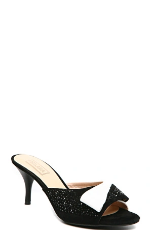 Женственные черные сабо. Модель на невысоком каблуке-шпилька, что подчеркнет стройность Ваших ног. Мысок заострен, декорирован украшением белого цвета. Украшены стразами.