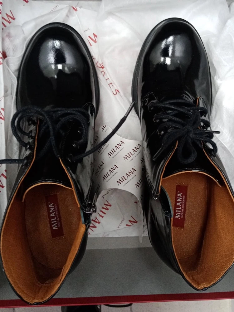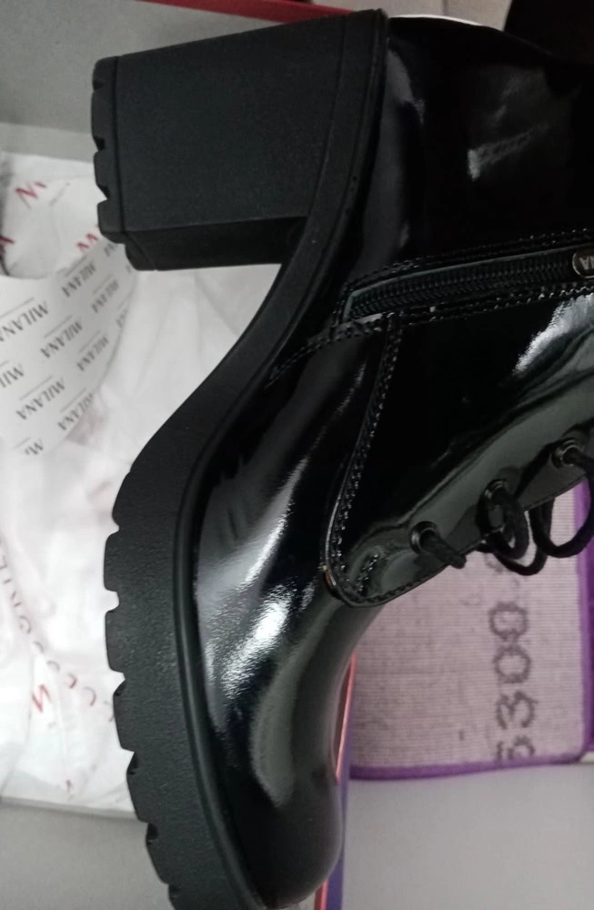Очень понравилась сама модель, села хорошо. Выполнена идеально, внутри хорошая качественная кожа, лак сверху тоже очень хорош, возможно заломов не будет в носке и вовсе. Не взяла так как хочется матовую модель. На вкус и цвет товарища нет, но создалось ощущение резиновых сапог, хотя на ноге достаточно изящно смотрятся. Подошли бы по всему. Скорблю...