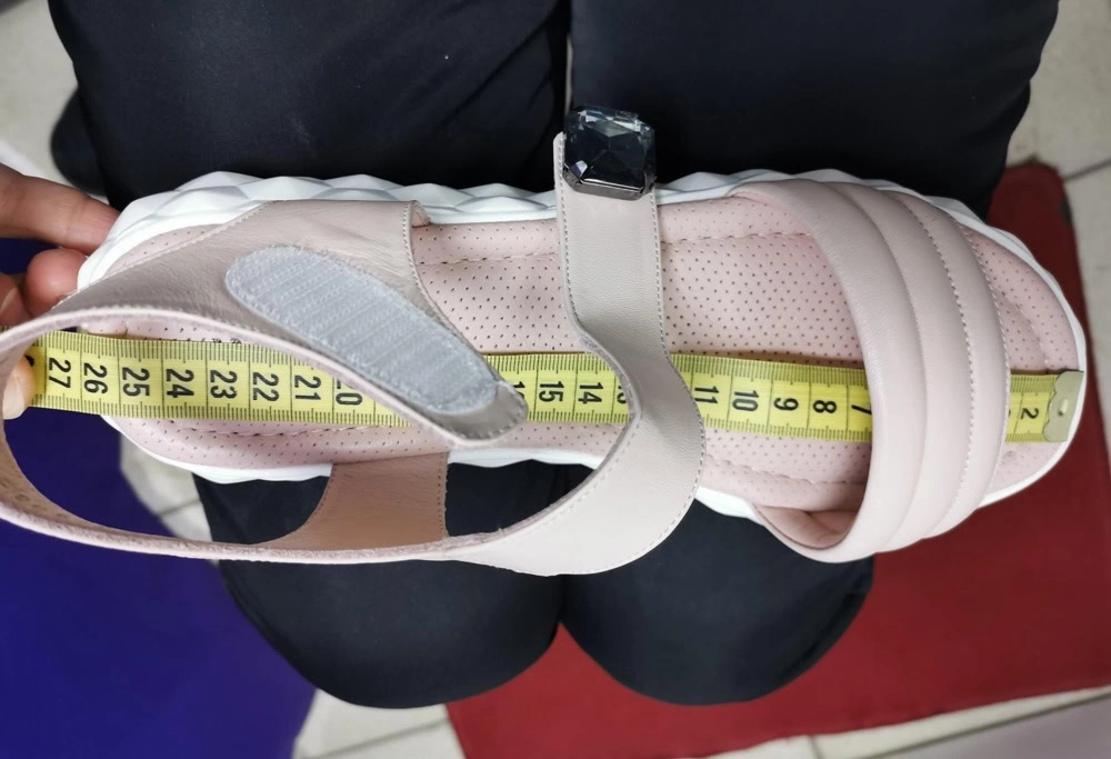Чтобы измерить длину ступни, необходимо встать на ровную поверхность, слегка касаясь пяткой находящейся сзади перпендикулярной ровной поверхности, например, стены без плинтуса.