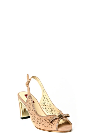 Милые бежевые босоножки. Модель выполненв из натуральных материалов, перфорирована, благодаря чему ноги будут чувствовать комфорт.Мысок закруглен, декорирован бантиком и стразами. Каблук-столбик украшен золотой вставкой.