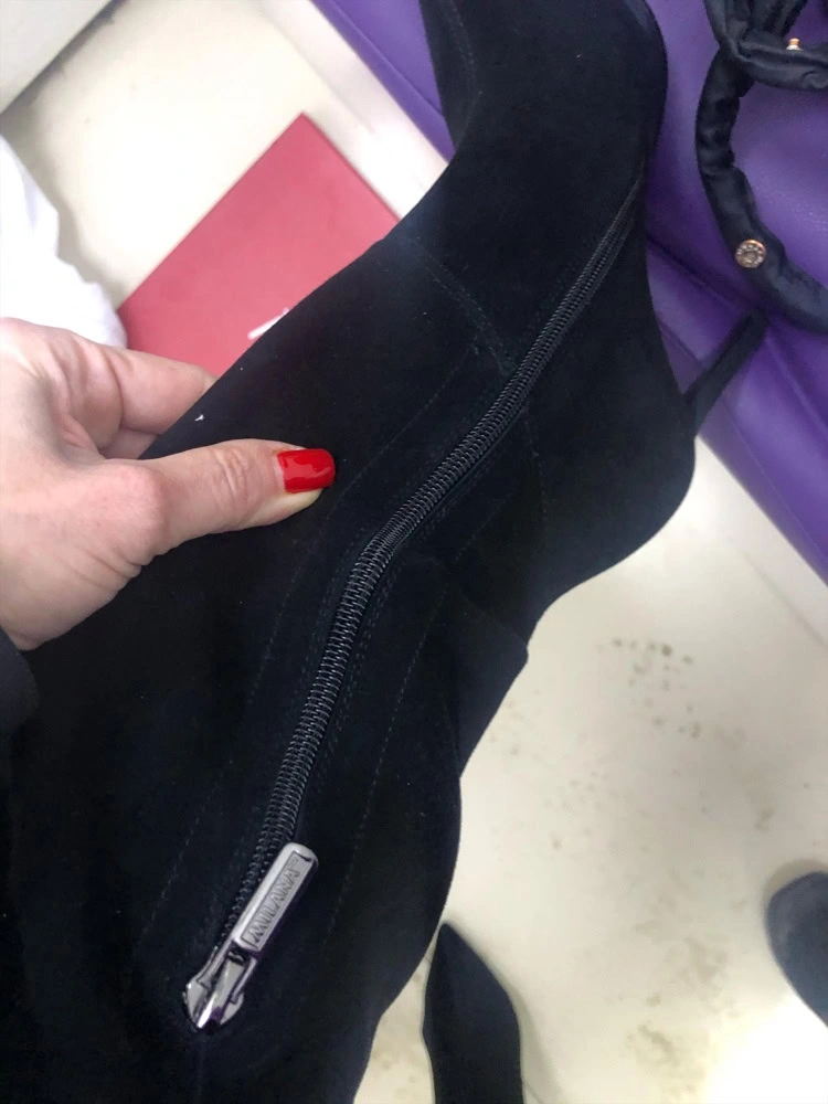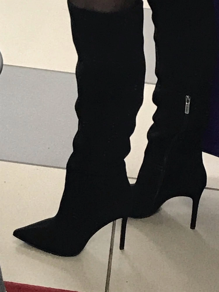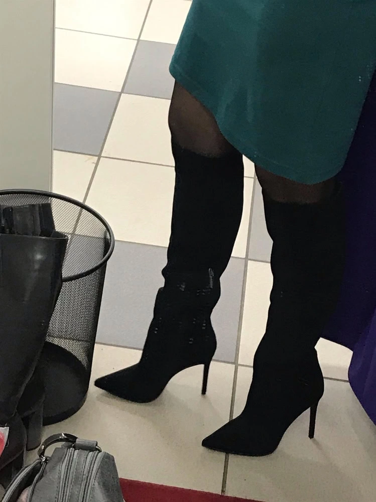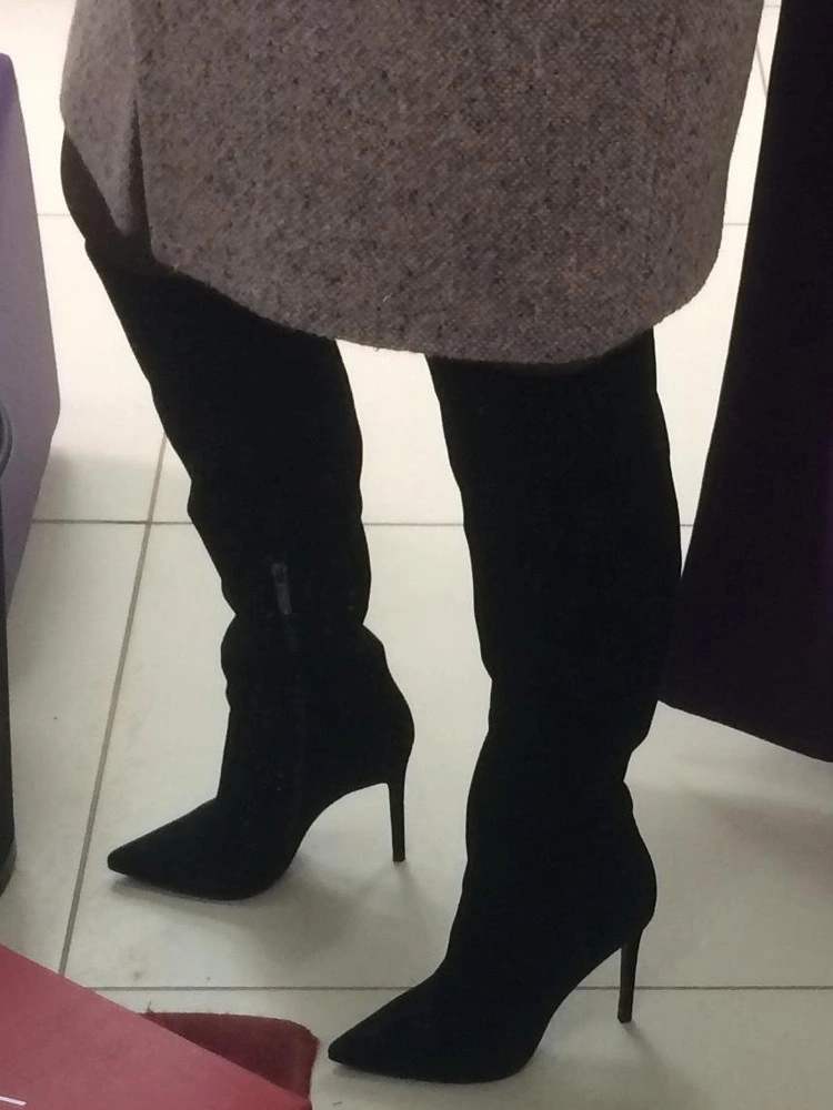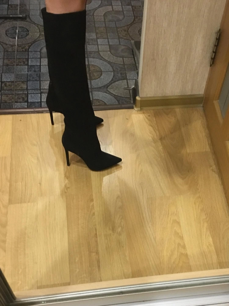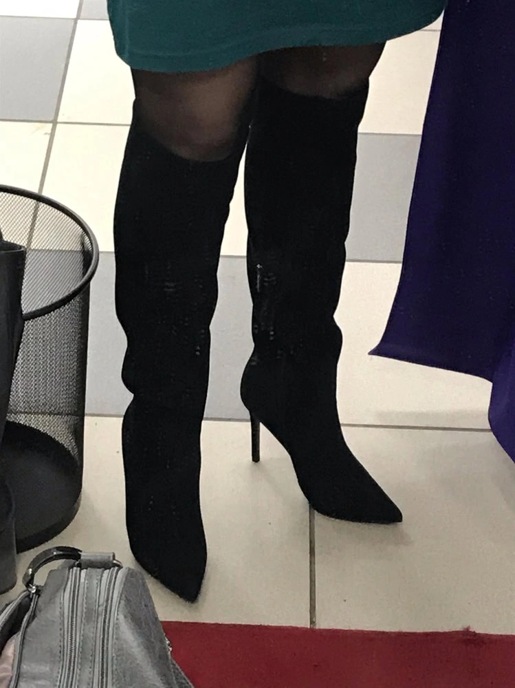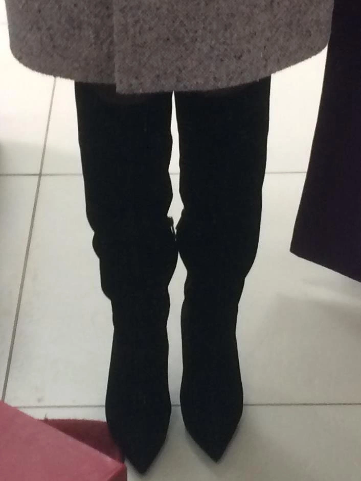 Сапоги классные, но мне не подошли. Ношу 37 размер, заказала 37 и 38, в 38 ноге комфортнее, но 37 тоже хорошо. У меня худая голень и внизу сапоги некрасиво сели гармошкой, а в области колена не смогла натянуть, туговато.
