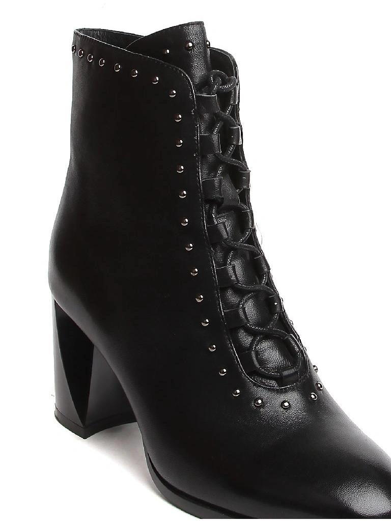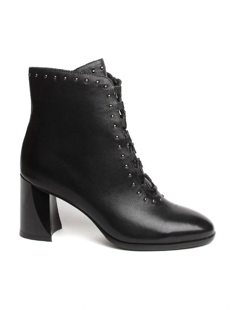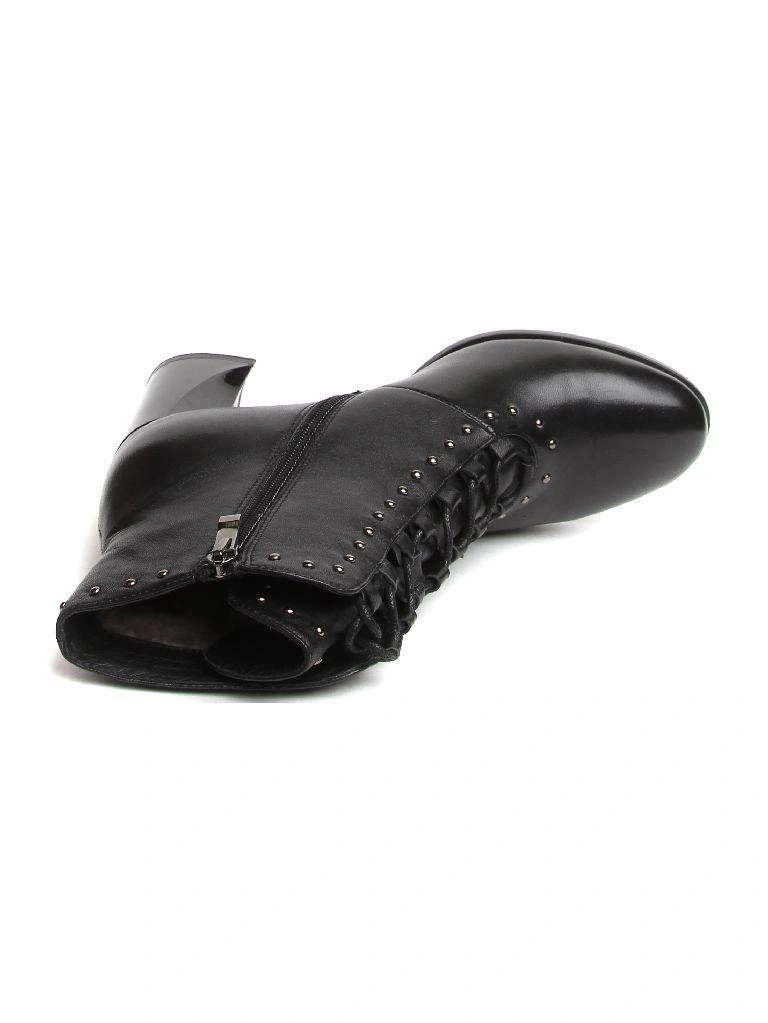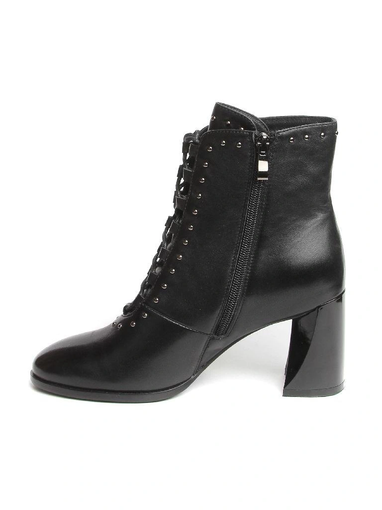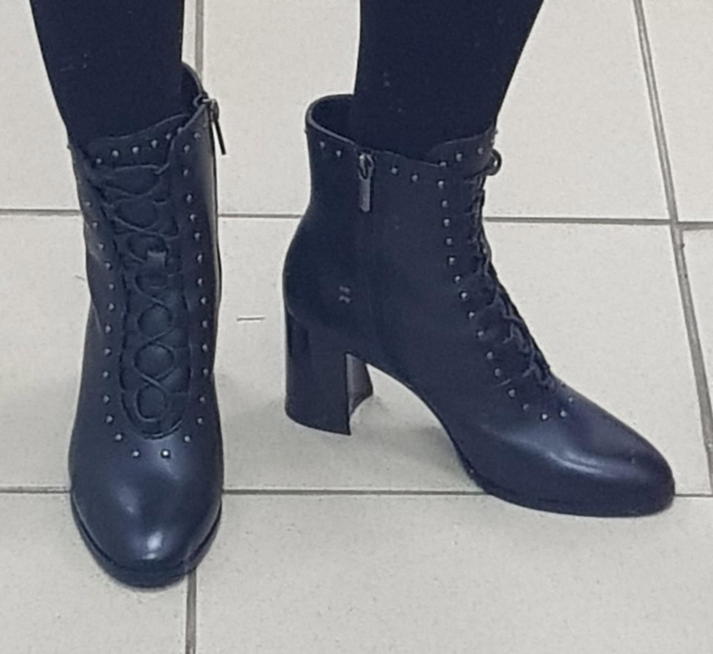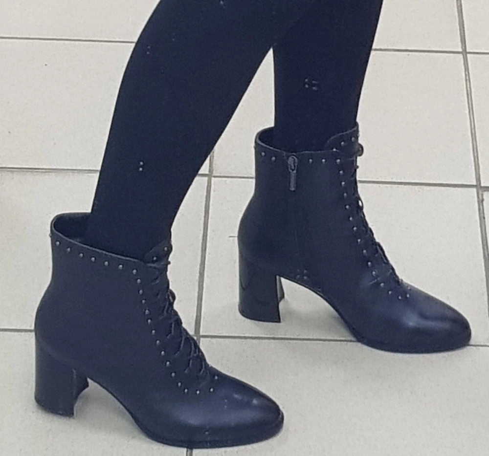 Хорошие ботильоны, особенно за такую цену. Кожа действительно натуральная, мягкая, ровно прокрашенная. Фасон однозначно для узкой ноги. Каблук удобный, удачная колодка. Изящная шнуровка, подчёркнутая декоративными матовыми заклёпками, элемент ретро-стиля. Вызывает некоторое сомнение в практичности лакировка каблука - надо аккуратно носить, поскольку такое покрытие неизбежно будет сбиваться о брусчатку.