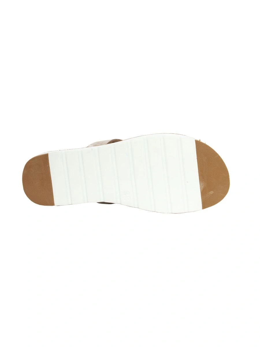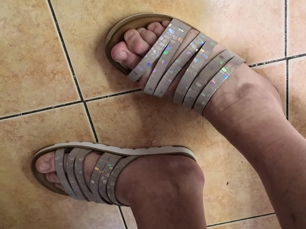 Очень удобные шлепки, стелька мягкая, подошва толстая, с таким рифлением не должна скользить на песке. Блеск умеренный. На мой взгляд визуально стройнят не самые изящные лодыжки.