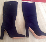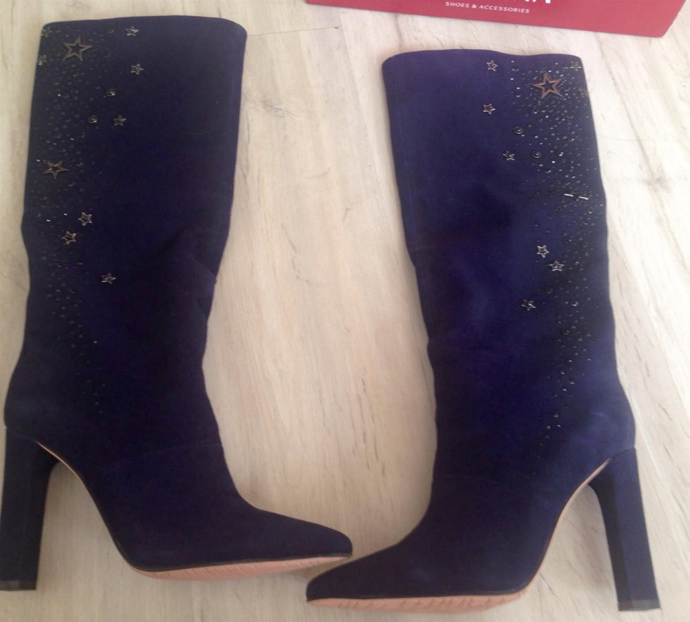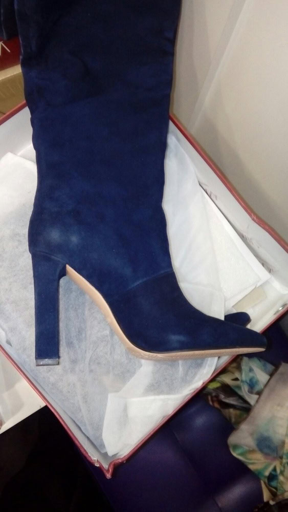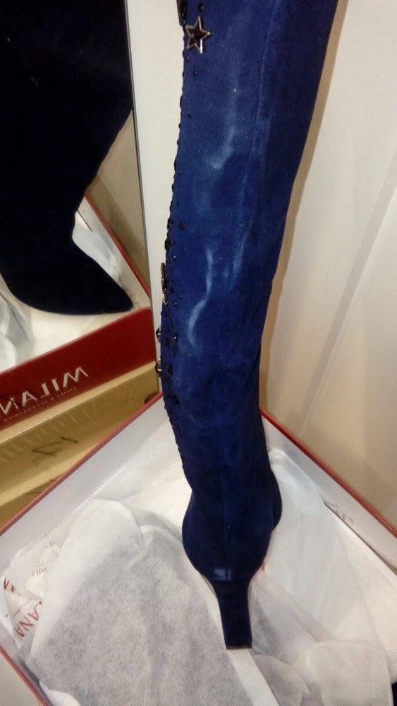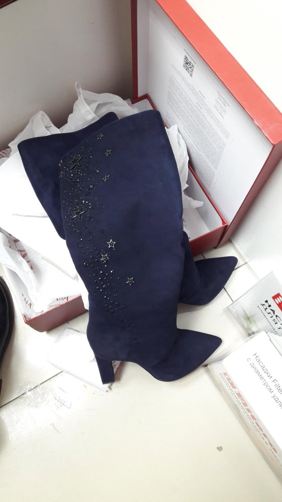 Сапоги классные, взяла за 6555, нормальная цена, сейчас туфли дороже стоят. Цвет глубокий синий, декор не аляпистый. Да , одевать , точнее даже снимать не очень удобно, но так как повседневно носить их не планирую , оставила. Планируй носить с шортами арт. 4727995008 Были небольшие потертости, примялись, но пароочиститель быстро решает эту проблему. Жалею, что не заказала сразу же такие бордовые, по были по 6500, а сейчас 39 размера уже нет.