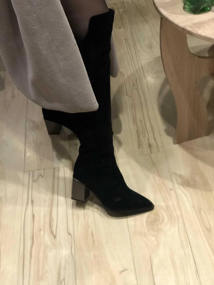 Качественные сапоги, кожаные не сошлись в голени, велюровые сели отлично, на свой 37,5 взяла 39 (с учетом тонких носков). Колодка удобная, каблук с набойкой 7,5 см.