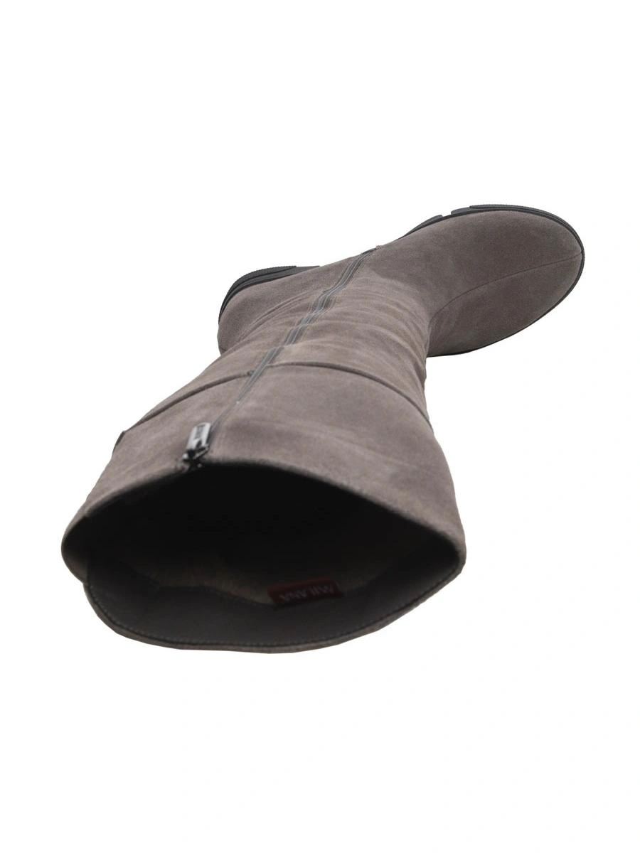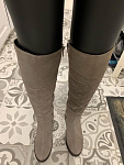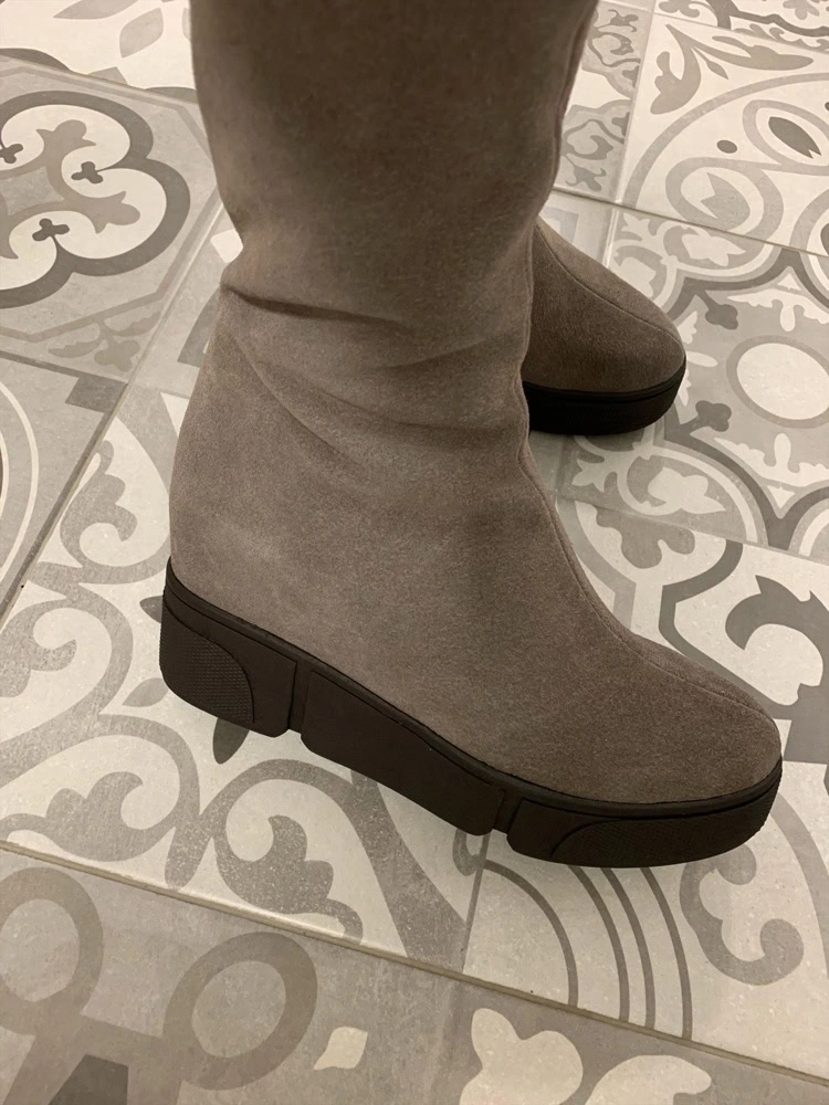 Сапоги хорошие.Размеру соответствуют! Ношу 37 размер, у этих 37го размера даже осталось немного места. На тонкой щиколотке даже в гормошку получилось, свободно. Но в верхней части один сапог шире другого минимум на 1 см, из-за чего отходит от ноги и топорщится. Поэтому и не взяла(( А так очень понравились. Платформа удобная, практически не чувствуется. Я обожаю на замше шов сверху, тк с ним замша со временем НЕ расползается и сапог держит форму, всегда выглядит аккуратно. Внутри толстый слой шерсти. Спилок практически как целиковая замша на ощупь. Цвет ближе к серому.