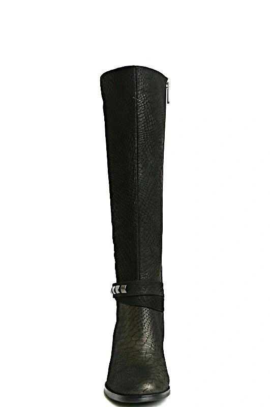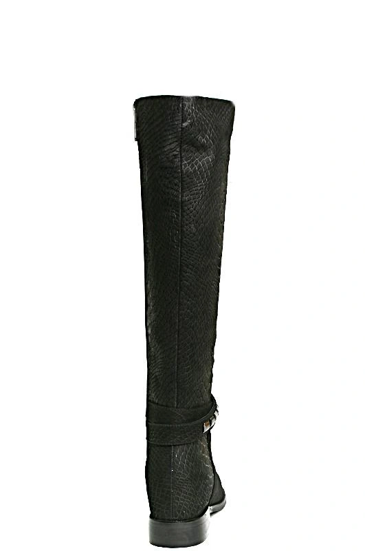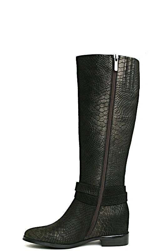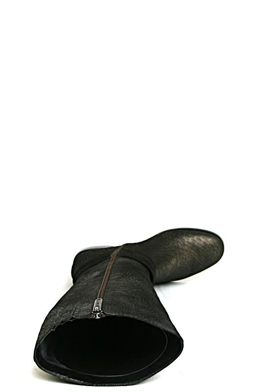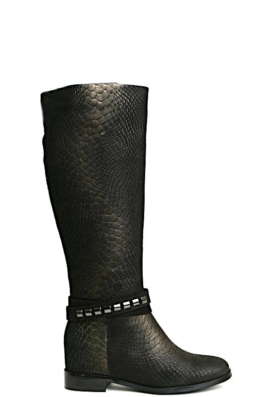 Пришли в неродной коробке, сложенные пополам. Так дорогую обувь не хранят. Нос не очень изящный. Сапоги черными назвать трудно, щедро покрыты золотым напылением. Эффектные. Средней полноты.