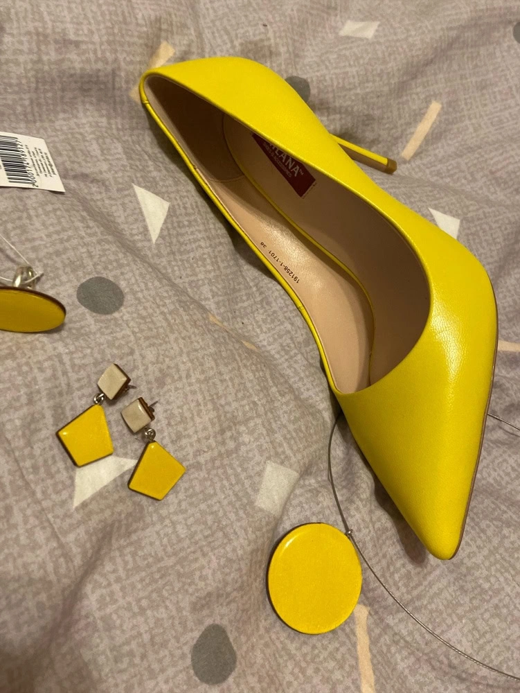 Туфли шикарного цвета, довольно удобные, хотя этой фирмы у меня 8 пар обуви, есть и удобнее модели. Но в целом они мне очень нравятся, таких лимонно-желтых мало. Маломерки . На стандартный 37 взяла 38, думала носить с полустелькой, но не понадобилось.