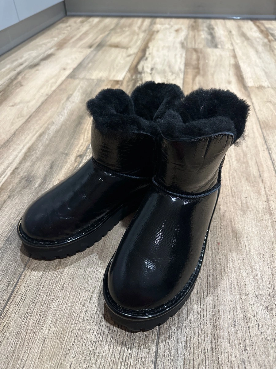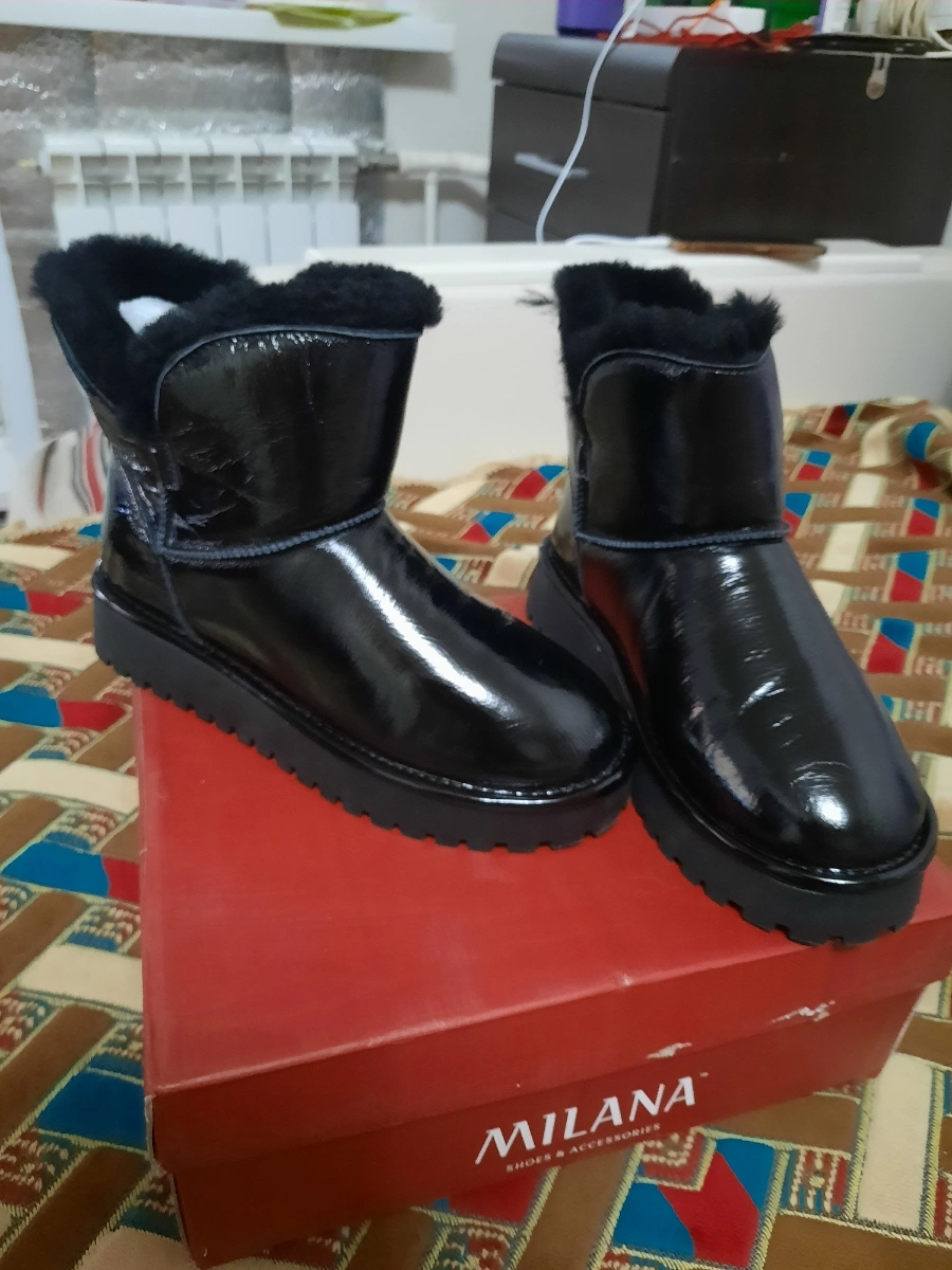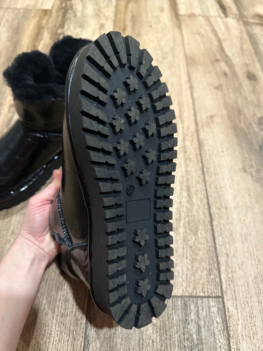 Ношу 37-37.5,заказала 38,в притык,но забрала,понравились.Толстая подошва,надеюсь не будут скользить,лаковая кожа,легко мыть,мех густой внутри,плотный.