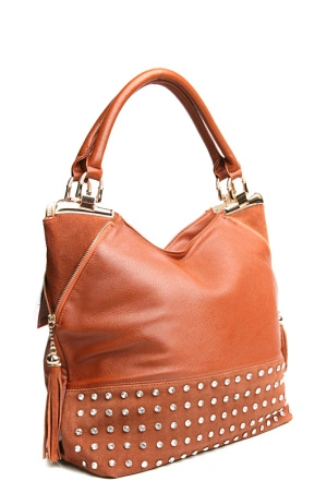 Стильная и вместительная дамская сумка классической формы из натуральной кожи двух видов выделки. Украшеная сто десятью хорошо закрепленными крупными стразами и молниями с кисточками из замши по бокам.Сумка закрывается на молнию, носится на сгибе руки. Ручки сумки прочно закреплены металличемкими креплениями. Помещаются документы формата А4.